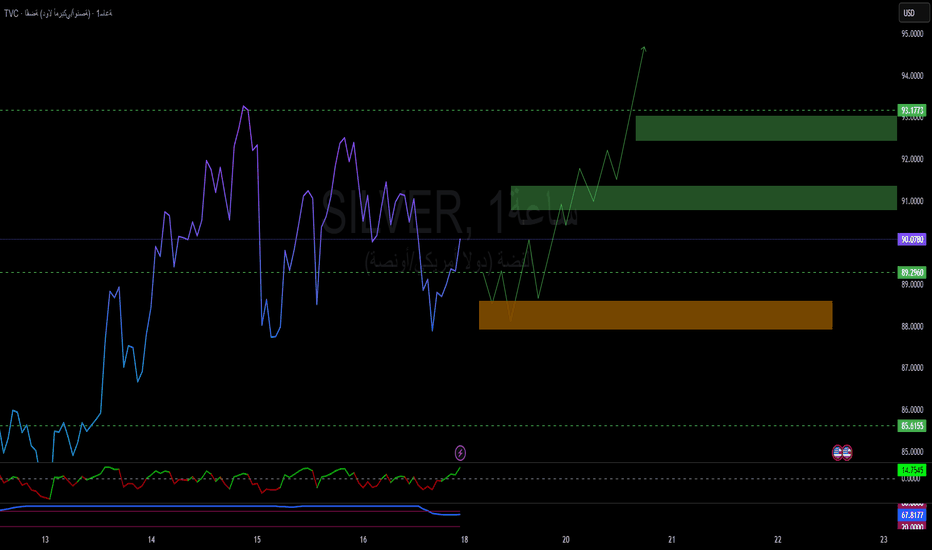 SILVER الفضة لا تتراجع… بل تعيد ترتيب السيطرةالفضة ما زالت داخل هيكل صاعد واضح على الفريم المعروض، وكل ما حدث مؤخرًا هو تصحيح عميق محسوب بعد فشل مؤقت في الثبات أعلى منطقة العرض القوية بين 92.80 – 93.20.