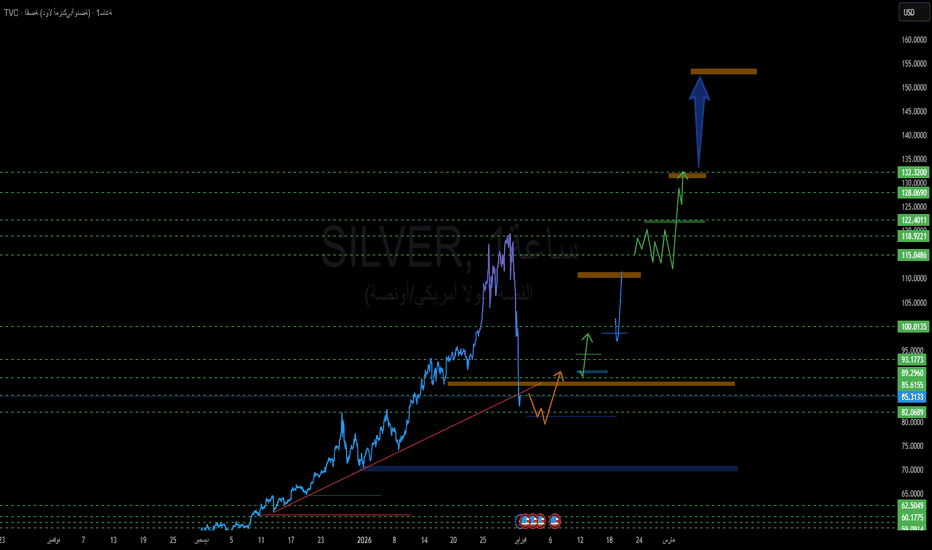 عودة الفضة: نموذج انعكاسي تاريخي يحبس أنفاس المتداولين!بعد موجة الهبوط العنيفة التي ضربت أسواق المعادن وتأثرت بالانهيارات في بورصة MCX الهندية وبورصات الصين، يظهر شارت الفضة (فريم الساعة) بوادر "انتفاضة" فنية قد تغير مجرى الاتجاه الهابط القصير الأمد.