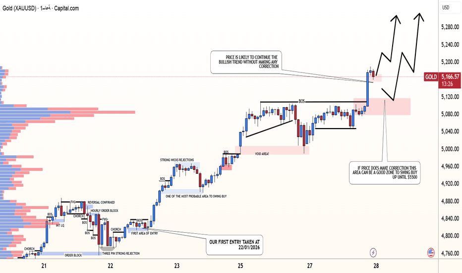 XAUUSD: اتجاه صاعد مع مناطق دعم ومقاومة رئيسيةيُظهر XAUUSD هيكل تداول Swing واضح مع اتجاه محدد وزخم وتوافق بين العرض والطلب. يبقى السعر صاعدًا، مشكلاً قممًا وقيعانًا أعلى، مدعومًا بشموع صاعدة ثابتة. بدأ الارتفاع الأخير من منطقة الطلب بالقرب من 5,000–5,030، والتي عملت كقاعدة لاستمرار الحركة.