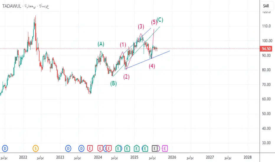 يتداول الراجحي عند سعر 94 ريال بالقرب من نهاية التصحيح الصاعد وجاء هذه التصحيح ثلاثي ABC انهى منها A و B والان يتداول في الموجه C والتي احتمال انها اتت قطريه خلفيه ويتبقى منها الموجه الخامسه والتي ستدفع السعر الى مستويات 109 /110