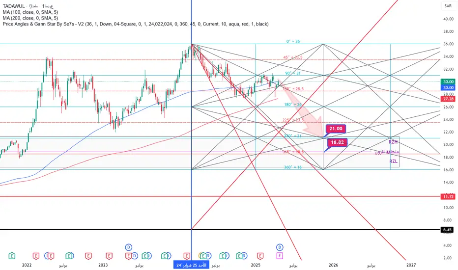 السهم الآن في موجة هابطة نحو تحقيق مستهدف الزوايا السعرية وهو الآن يمثل اختبار حقيقي نحو الإغلاق فوق متوسط 100 اسبوع ومن المتوقع أنه في مساره الهابط حتى منتصف منطقة الزوون ويعتبر ذلك بعيدا عن سعره الحالي لنتابع ....