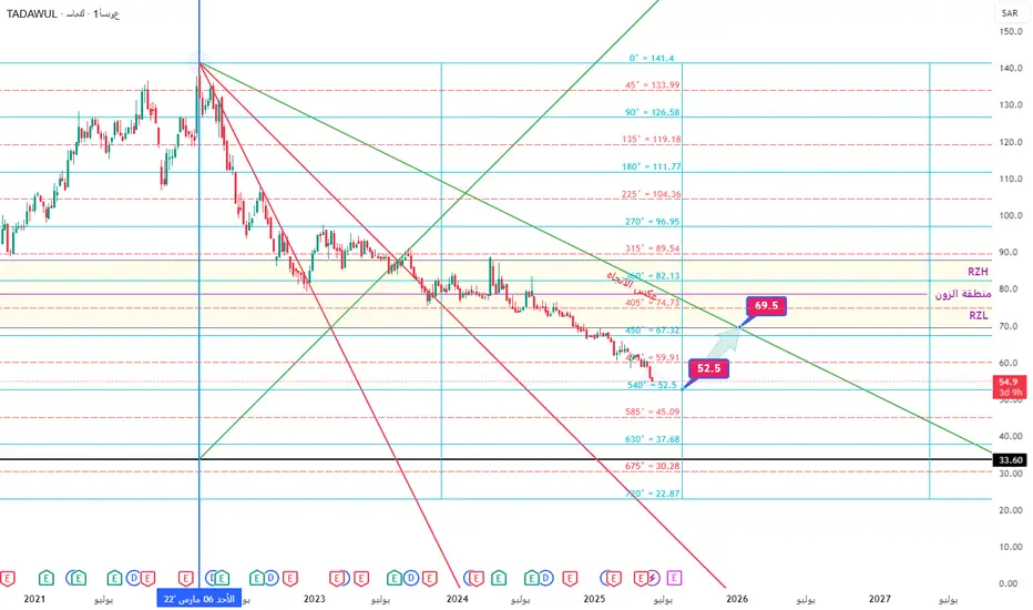 السهم وصل إلى مستهدف الزوايا السعرية تحديدا نقطة الانعكاس 52.50 عند الزاوية 540ْ وهي نقطة الارتداد إن شاء الله إلى منطقة الزوون لنتابع وبالله التوفيق ....