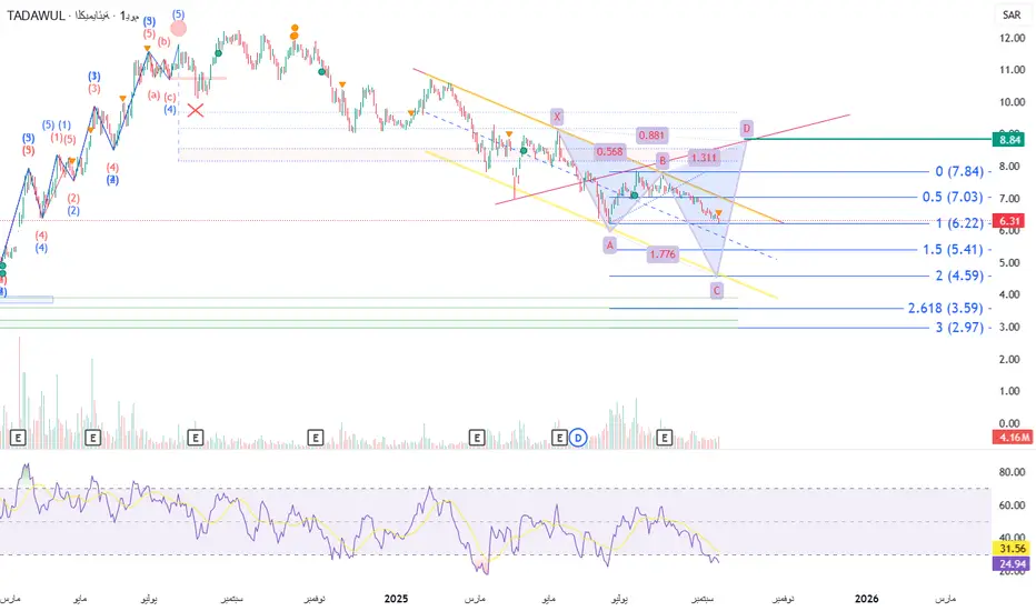 السهم فياً يشكل حتى الان قمم وقيعان هابطة وفي طور تكون نموذج هارمونيك