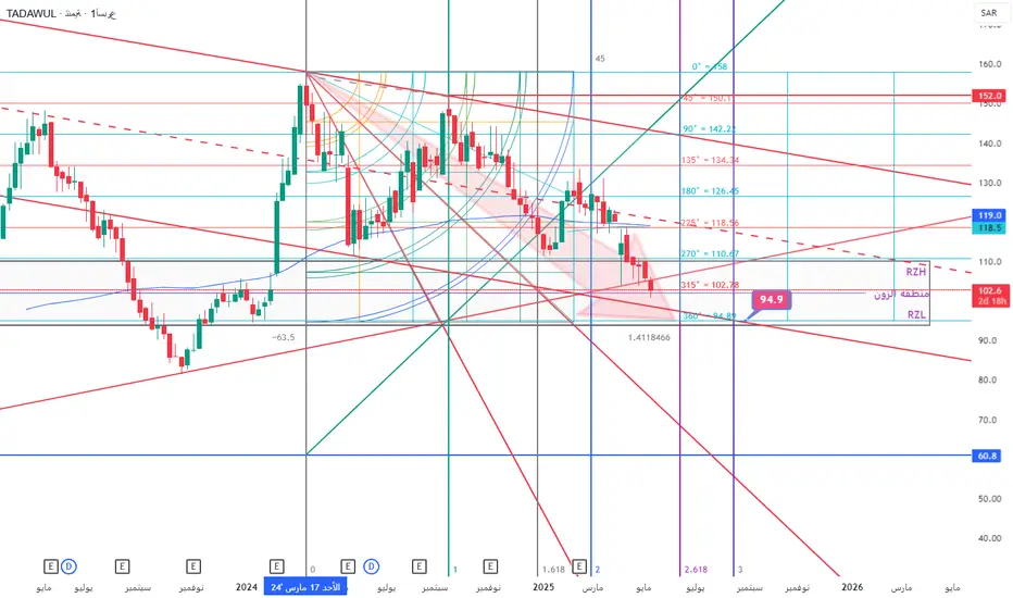 السهم مساره هابط قريبا من تحقيق مستهدف الزوايا السعرية والذي يعتبر أسفل منطقة الزون عند الزاوية 360ْ والذي أكد مساره الهابط عند إغلاقه أسفل الترند الصاعد التاريخي زكذلك يتوافق مع أسفل القناة الهابطة لنتابع انعكاس الاتجاه ....
