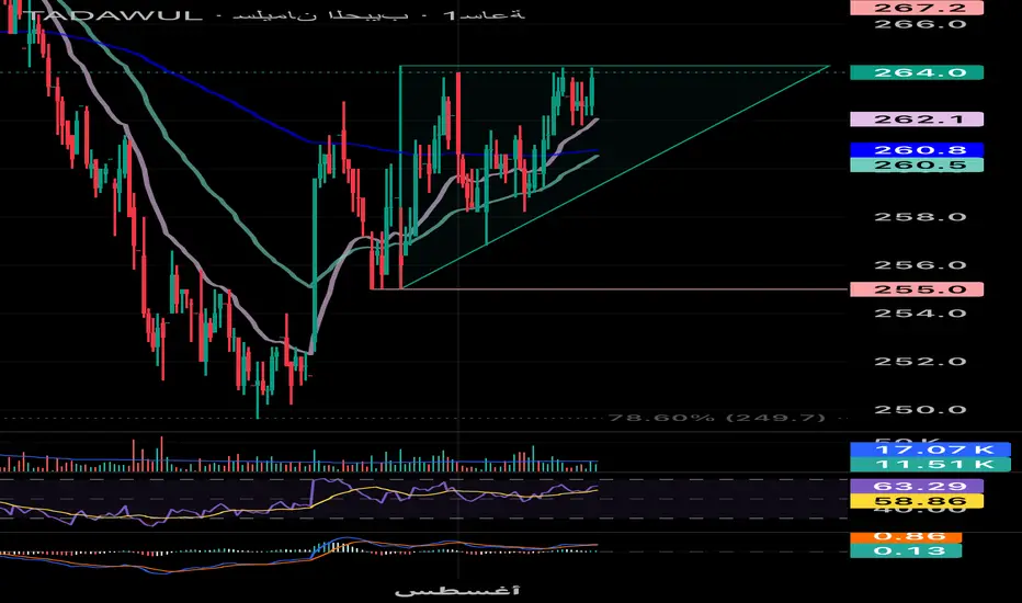 ▪️ الضلع العلوي الأفقي (سقف المثلث) يتمركز عند 264.2 ريال، وهو مستوى تمت ملامسته أكثر من مرة دون اختراق حتى لحظة التحليل.
