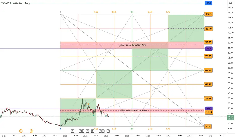 21.19 – 24.62 ريال تمثل منطقة انعكاس محتملة، واختراقها بإغلاق أسبوعي قوي يُعد إشارة فنية إيجابية.