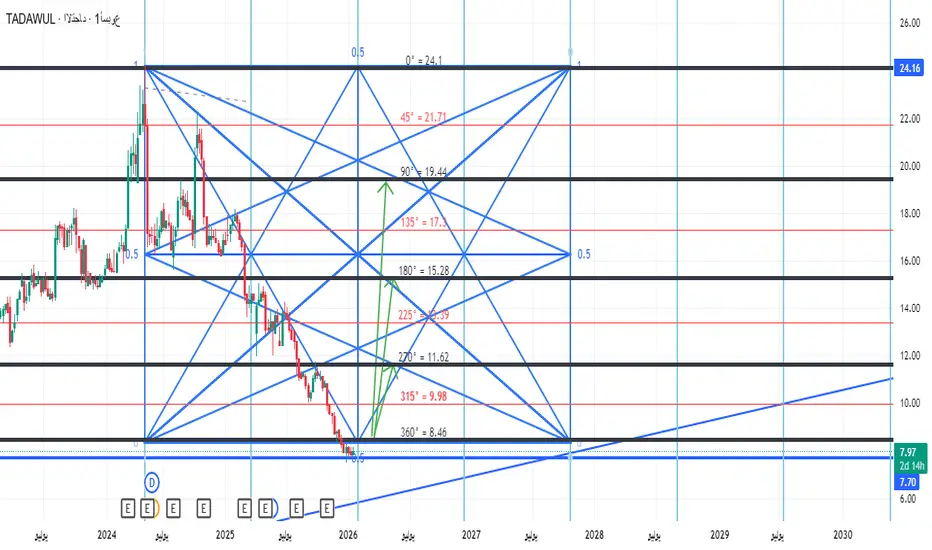 اكمل السهم دورة سعرية هابطه عند 8.46 لذلك نتوقع انعكاس هذا الاتجاه الهابط للسهم من المنطقة الحاليه ويتاكد الانعكاس باختراق 8.46 والاغلاق اعلها بشمعة يوم صاعده حينها يستهدف السهم 11.60 ثم 15.28 وباختراقها يستهدف 19.44