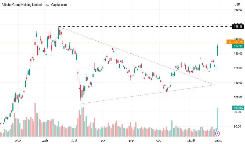 غالبًا ما يكون من السهل التعرف على اختراقات من مراحل التماسك بعد حدوثها، لكن حتى يوم أمس كان الرسم البياني اليومي لسهم علي بابا يعاني من تقلبات غير منتظمة. تغير ذلك مع ظهور فجوة سعرية صعودية دفعت السهم للخروج بوضوح من نمط الوتد. تلت الفجوة إغلاق يومي قوي مدعوم بأحجام تداول مرتفعة، ما عزز من مصداقية الحركة وفتح الباب لاحتمال إعادة اختبار قمم مارس إذا استمر الزخم.