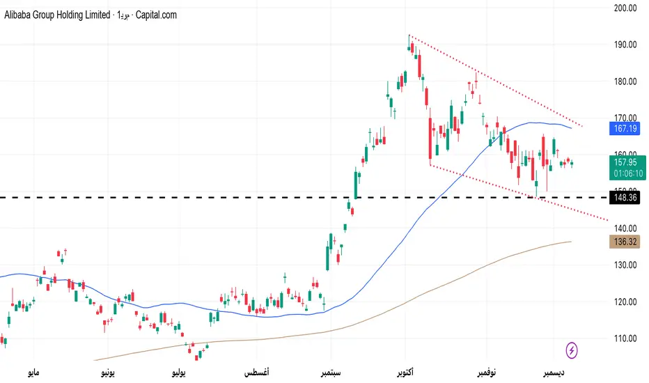 من منظور فني، يواصل سهم علي بابا الانضغاط داخل هيكل ضيق متقلص. ويُظهر خط الاتجاه الهابط الممتد من قمم الخريف ضغطًا على المدى القصير، في حين أن منطقة اختراق الصيف تعمل كمنطقة دعم في الوقت الحالي. ولا يزال السعر دون متوسط 50 يوم، مما يعزز الشعور بأن السوق ينتظر محفزًا.