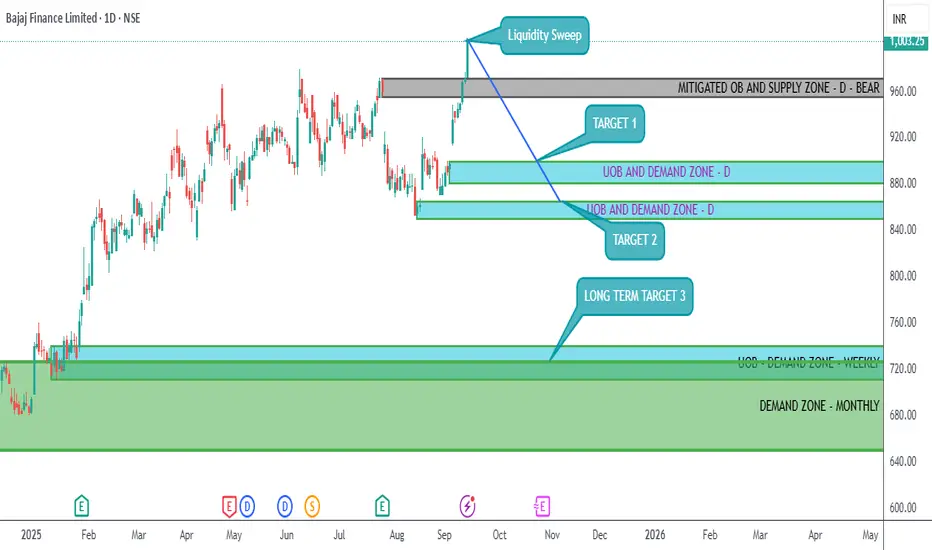 As BAJFINANCE is rising as of now above a 1000 mark, this is barely a liquidity sweep taking place and big institutions entering into sell on a larger scale. After this liquidity sweep is over, BAJFINANCE will start declining and a major decline is anticipated.