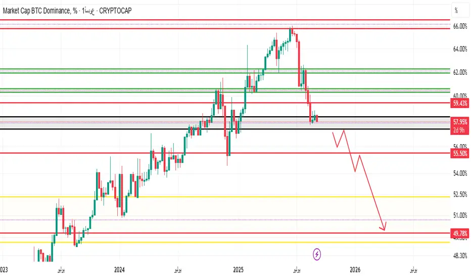 الكسر أسفل منطقة 57-58% قد يدفع الهيمنة إلى منتصف الـ 50% Market Cap BTC Dominance, % Ideas — CRYPTOCAP:BTC.D — TradingView