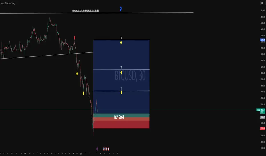 بعد المتابعة الدقيقة لتحركات سعر البتكوين (BTCUSD) خلال الساعات الماضية، أشارككم رؤيتي لنهاية هذا الأسبوع. نحن حالياً عند منطقة سعريّة مثيرة للاهتمام للغاية توفر فرصة شراء ذات احتمالية عالية.