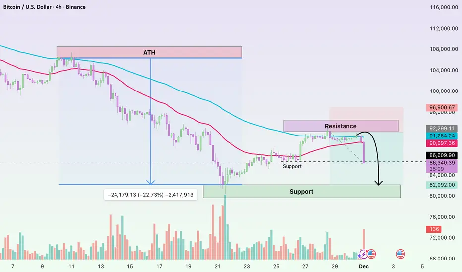 The 86,000–86,500 zone now serves as strong support, coinciding with the recent low and EMA 89. How price reacts around this area will determine the next move: a retest of 89,000–90,000 awaits resistance at the EMA 34, while any break below would extend the decline toward 83,500 or even down to 80,000—where liquidity is concentrated from previous lows.