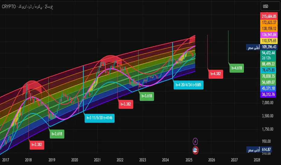 الصورة توضح قوس قزح الدورات السابقة لاحظ انه لم بصل للقمة التي هي ذروة الجنون القوس الاحمر الصغير بنهاية كل دورة