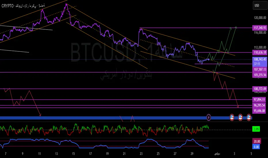 البتكوين ما زال داخل قناة هابطة منذ قمّة 117K. السعر حالياً عند 108,700 ويواجه اختباراً محورياً: هل ينجح في كسر سقف القناة نحو 110,636 ليفتح طريق 117,340، أم يسقط مجدداً إلى مناطق 100K وما دونها؟