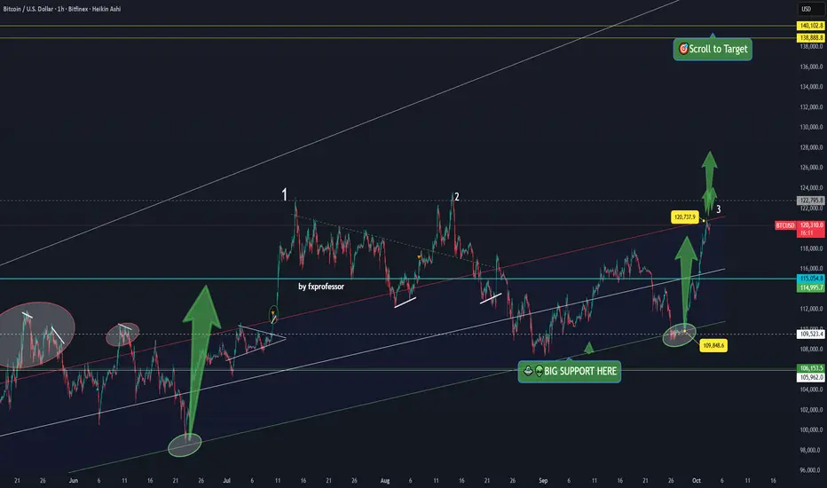 Yesterday, I highlighted the level at $120,737 — the very top of the move. And here we are again, pressing for the third attempt higher inside the same ascending channel I’ve been sharing with you for weeks.