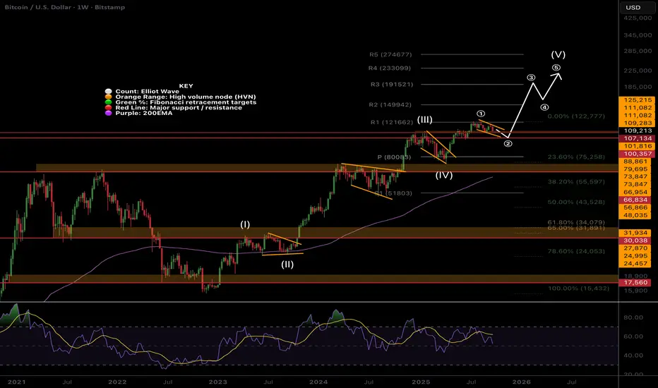 Wave (1) of V into all high appears complete at the R1 pivot. Wave 2 has a downside target of the next High Volume Node at $107k the previous all time high range.