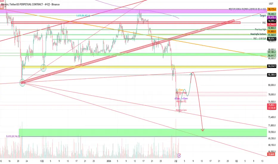 저점갱신을 계속 하고 있는 시점에서 74K 마지노선까지 이탈하게되면 69K - 52K 까지도 하락 할 수있는것을 염두에 두어야 합니다
