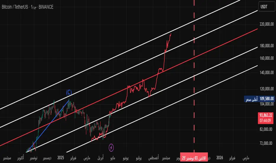 الصورة توضح نسخة من المنشور السابق للقناة الصاعدة مع حركة البيتكوين المتوقعة من حركة سابقة باللون الاحمر البول رن ينتهي بين اكتوبر وبداية نوفمبر كن حذر