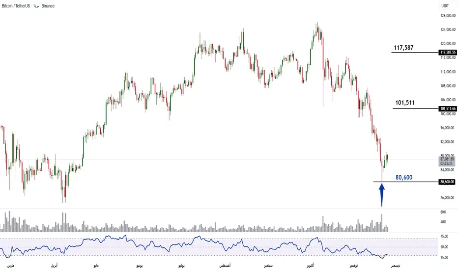 بعد هبوط الأسعار بقوة خلال الأيام الماضية وصلت الأسعار لمناطق إرتداد محتملة بإستخدام نسب فيبوناتشي (الهرمنيك) وهو ما تزامن مع إرتفاع أحجام التدوال بشكل ملحوظ كما هو موضحه على الرسم بالسهم الأزرق وطبقا" للقاعدة التي تنص على (إرتفاع أحجام التدوال بشكل ملحوظ بعد موجة هبوط إشارة شراء) نتوقع أن تظهر القوى الشرائية مستهدفه إختبار المقاومات 101,511 ثم 117,587 مع وضع حد وقف خسائر عند تـأكيد كسر أقل سعر في جلسة التدوال التي فيها أحجام التدول مرتفعة وهو 80,600