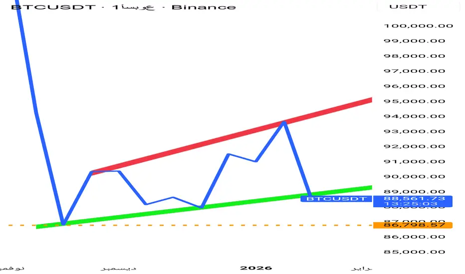 على الرغم من التذبذب الصاعد الأخير، إلا أن الشارت يرسل إشارات تتطلب الحذر. يظهر البيتكوين حالياً سلوكاً سعرياً داخل قناة صاعدة ضيقة (Rising Channel) بعد موجة هبوط حادة، وهو ما يعرف فنياً بنموذج العلم الهابط (Bearish Flag).