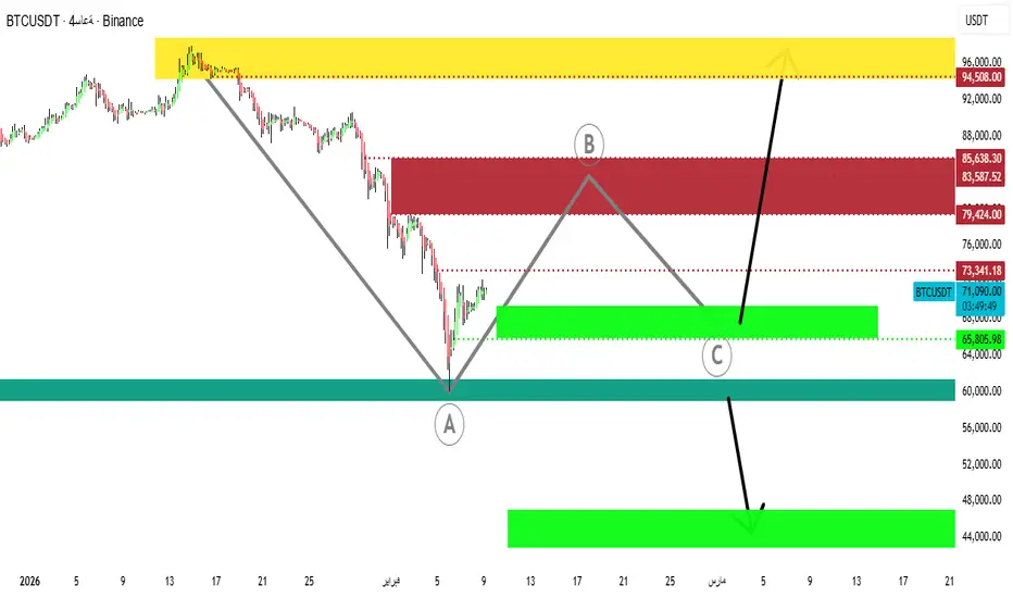 نحن الآن أمام مرحلة حسّاسة جدًا في مسار البيتكوين، حيث يتحرك السعر ضمن موجة ارتدادية تصحيحية بعد الهبوط العنيف الأخير.