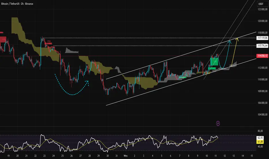 Bitcoin (BTC/USDT) na BINANCE nadal oscyluje w kanale trendu wzrostowego i utrzymuje wyraźną strukturę wyższego szczytu i wyższego dołka. Po technicznej korekcie linii trendu, siła nabywcza ponownie się pojawiła, utrzymując cenę powyżej strefy 114 tys. Chmura Ichimoku rozszerza się, wspierając trend, a RSI utrzymuje się powyżej progu 60, co wskazuje na utrzymujący się trend wzrostowy.
