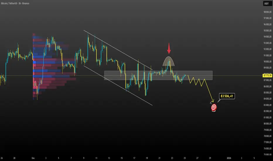 Le prix évolue latéralement sous la zone d'offre de 87,8k-88k, avec une structure de sommet inférieur clairement formée après l'échec du rebond. Le canal baissier précédent n'a pas été franchi ; les mouvements haussiers actuels ne sont que des replis au sein d'une tendance baissière.