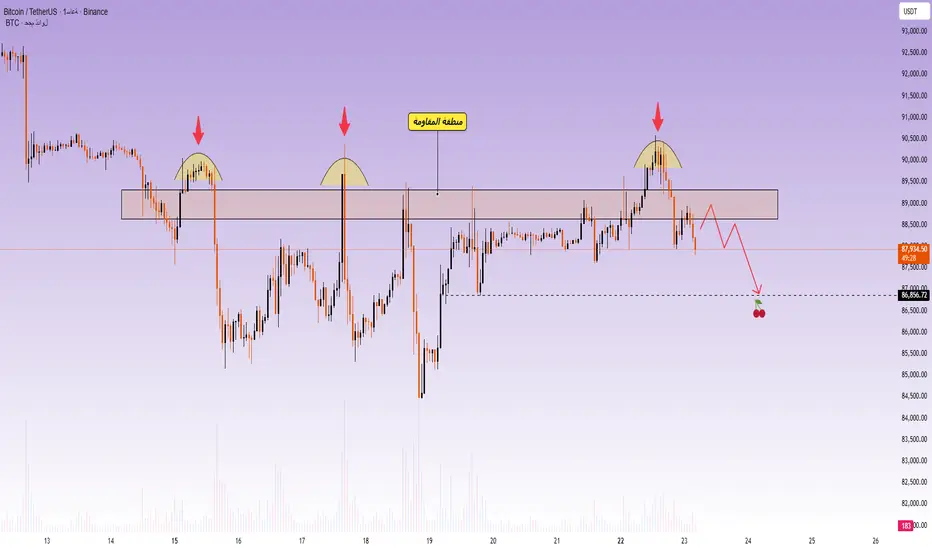 نظرًا لفشل البيتكوين في استعادة منطقة المقاومة، فمن المرجح أن يتحرك السوق بشكل جانبي ثم يتراجع، مما يفتح المجال لاستمرار الاتجاه الهبوطي. يستهدف التصحيح مستوى 86,800 - 87,000، وهو ما يتوافق مع منطقة الارتداد السابقة.