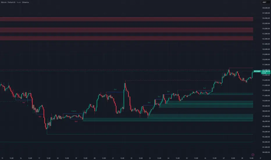 السعر الآن يتحرك بالقرب من منطقة عرض قوية بين 116,000 – 117,000، وهي منطقة محتملة لحدوث تصحيح بسيط قبل مواصلة الصعود نحو مناطق العرض الأعلى بين 122,000 – 125,000.