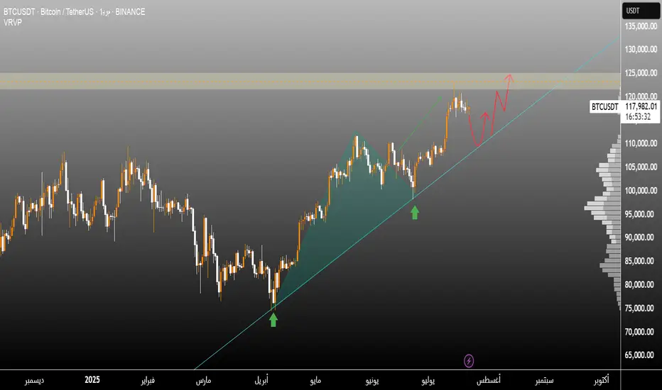 يرسم البيتكوين حالياً لوحة مثالية لاتجاه صاعد قوي: خط الاتجاه الداعم لا يزال صامداً منذ عدة أشهر، ضغط شراء واضح عند مناطق FVG، والسعر يستعد لاختبار القمة السابقة قرب 124,000.