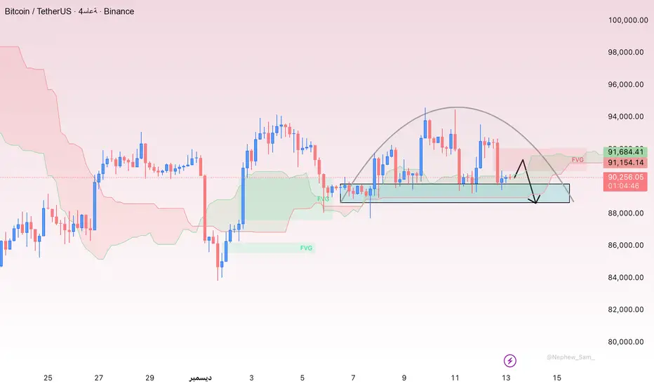 السعر يتحرك عرضياً بين 90,000 و92,000، مع ضغوط بيع متكررة قرب منطقة FVG عند 91,500–92,500. في الأسفل، لا تزال منطقة 89,500–90,000 مدعومة بسحابة إيشيموكو، ما يشير إلى توازن مؤقت في السوق.