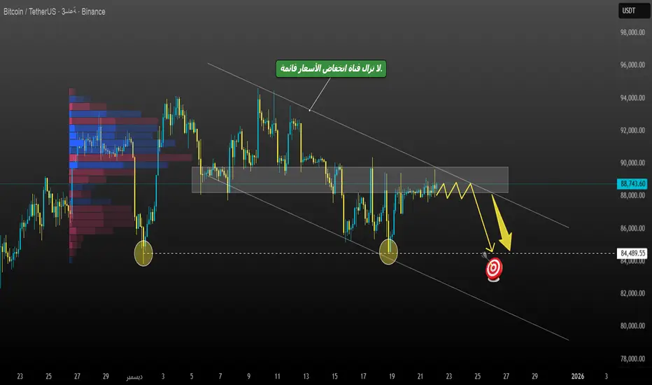 إذا لم يتمكن السعر من اختراق نطاق التذبذب الحالي، فإن السيناريو الأرجح هو اختراق مستوى الدعم، مما سيؤدي إلى امتداد الهبوط إلى منطقة 84-85 ألفًا، وهي المنطقة المستهدفة الموضحة على الرسم البياني.
