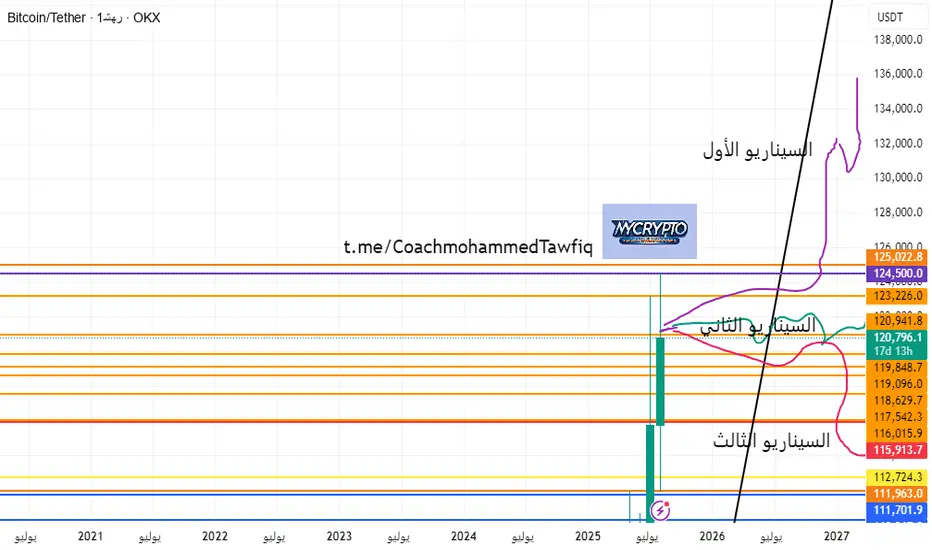 ارتداد نحو 125,000$، ثم التوجه إلى 135,000 – 136,000$ وربما حتى 164,000$. في هذه الحالة قد يدخل السوق في حالة FOMO، مع استمرار الصعود ولكن بوتيرة أهدأ من الموجات السابقة.