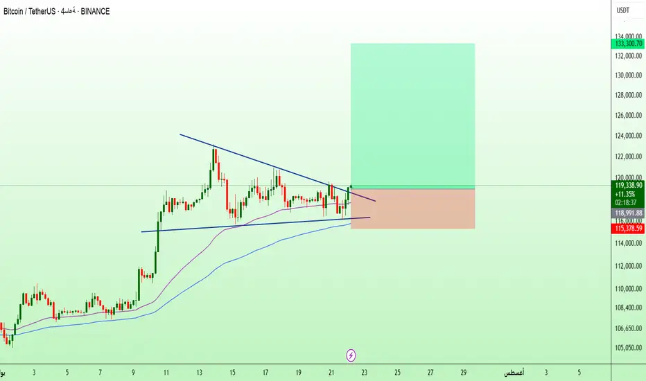 يتماسك سعر البيتكوين حاليًا داخل نموذج مثلث متماثل على الإطار الزمني لأربع ساعات، مما يُظهر مؤشرات على احتمالية اختراقه. بعد ارتفاع قوي في أوائل يوليو، دخل البيتكوين مرحلة ضغط، مُشكلًا قممًا أدنى وقيعانًا أعلى - وهو وضع نموذجي لاختراق التقلبات.