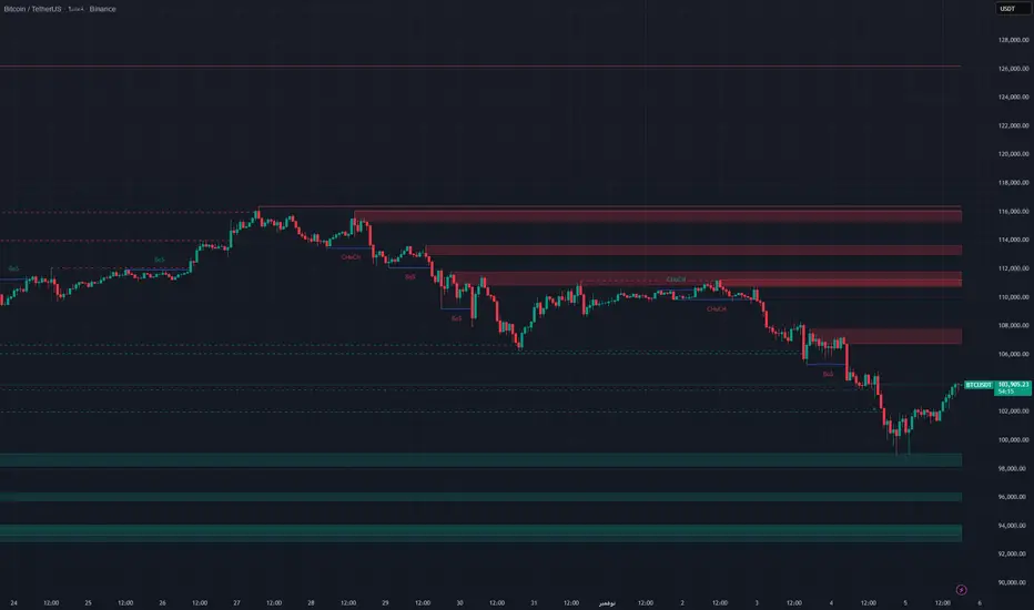 شهد السوق مؤخرًا تغيّر هيكل (CHoCH) ضعيف على الأطر الزمنية الصغيرة بعد ارتداد من منطقة الطلب 100,000 – 99,000، مما يشير إلى احتمال تصحيح مؤقت قبل استمرار الاتجاه الهابط.