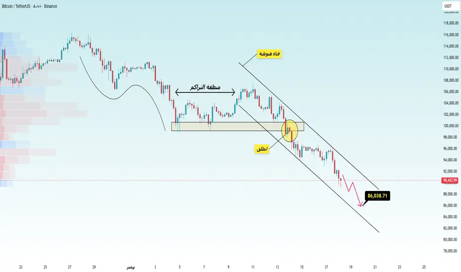 يتحرك السعر داخل قناة هبوطية واضحة، مع سلسلة متواصلة من قمة هابطة وقاع هابط. لا تزال منطقة العرض بين 92,000 و93,000 نشطة، مما يدفع السعر للانخفاض مباشرة من آخر إعادة اختبار.