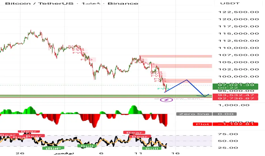 السعر بعد هبوط قوي من 107,000$ إلى 95,000$ تقريباً، ثم ارتداد بسيط إلى 97,000$.
