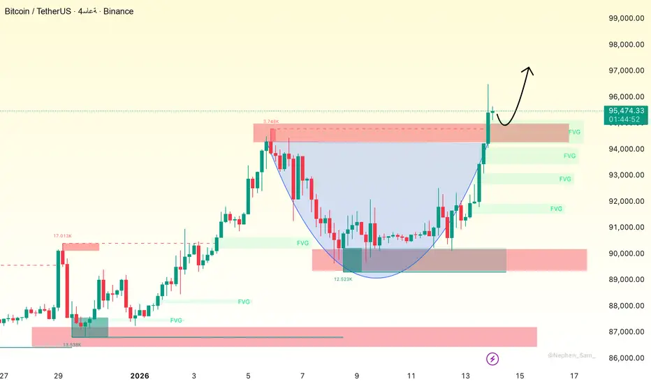 سجّل بيتكوين على إطار الأربع ساعات حركة اندفاعية واضحة بعد اختراق نطاق التذبذب بين 90,000 و92,000 وتكوين قمة أعلى، ما يؤكد عودة الاتجاه الصاعد. الحركة السريعة تركت خلفها عدة مناطق FVG، في إشارة إلى دخول سيولة قوية. مع ذلك، تظهر منطقة 95,300–95,600 عمليات جني أرباح قصيرة الأجل، ما يرجّح حدوث تصحيح فني قبل أي امتداد جديد.