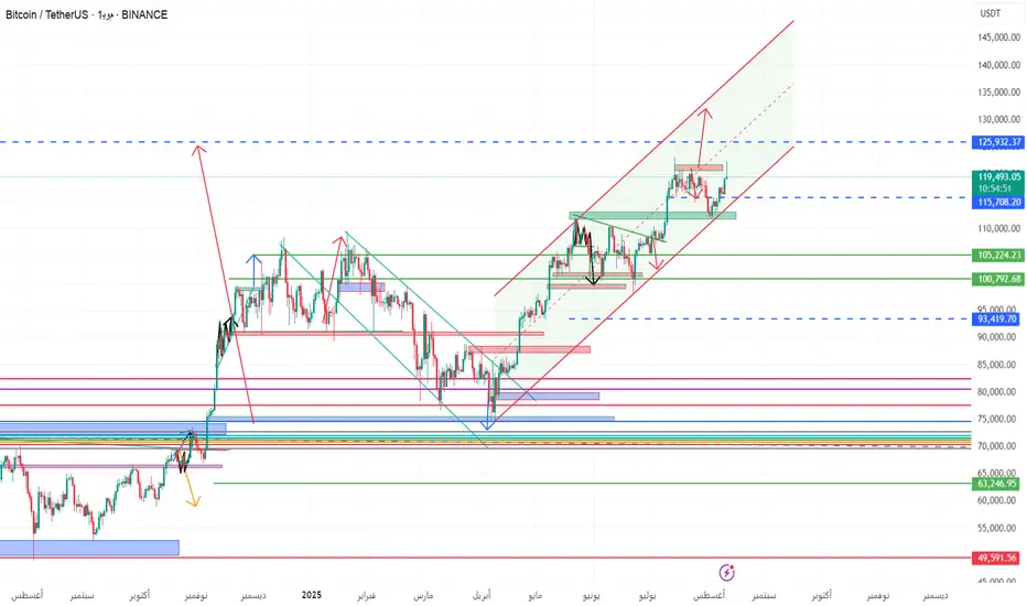 الاتجاه العام للبيتكوين صاعد على المدى المتوسط، مع احتمال استمرار الصعود نحو قمم جديدة في حال تجاوز المقاومة 125,932، بينما يبقى كسر الدعم 115,708 إشارة لتحول مؤقت نحو تصحيح أعمق.