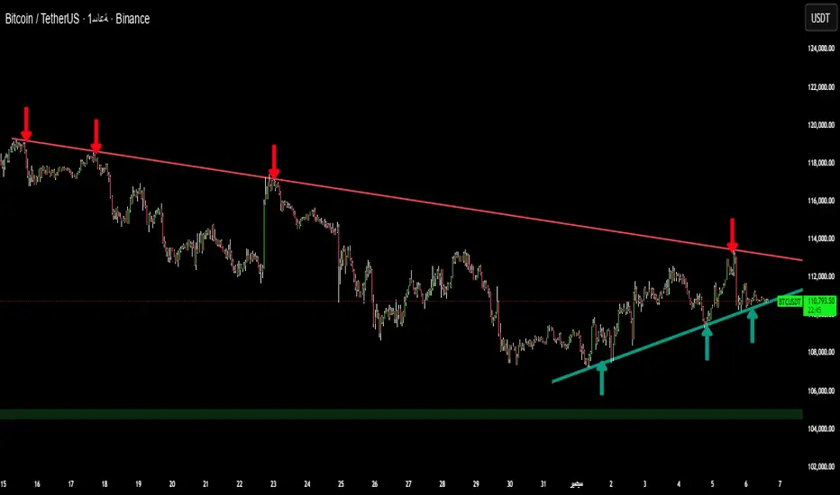 كسر خط الدعم الصاعد (الوتد) أسفل 109,500 → أول إشارة سلبية مؤكدة.