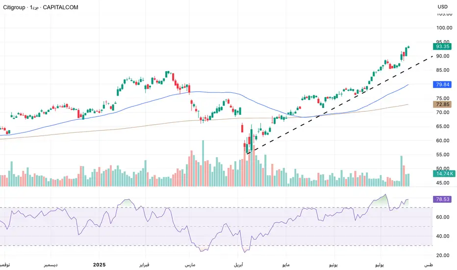من الناحية الفنية، سجل سهم سيتي ارتفاعًا إلى قمم اتجاهية جديدة بدعم من أحجام تداول قوية. ويُظهر السهم زخمًا واضحًا ضمن مسار تصاعدي مستقر. ومع ذلك، فإن مؤشر القوة النسبية (RSI) يشير إلى حالة تشبع شرائي، مما قد يدفع المتداولين إلى انتظار تراجع فني طفيف أو مرحلة من التماسك السعري للحصول على نقطة دخول أكثر ملاءمة من حيث نسبة العائد إلى المخاطرة.