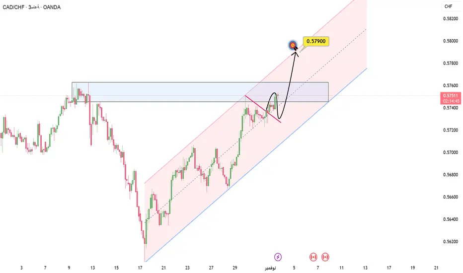 تحرك سعر CADCHF بوضوح داخل القناة الصاعدة، مما يُظهر هيكلًا صعوديًا قويًا مع قمم وقيعان أعلى بشكل متتالٍ.