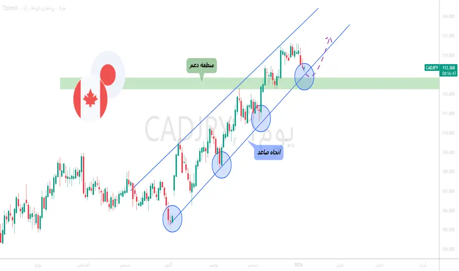 زوج CADJPY يتحرك منذ فترة ضمن قناة صاعدة واضحة باللون الأزرق، مع قمم وقيعان أعلى، ما يؤكد أن الزخم العام ما زال صاعدًا.
