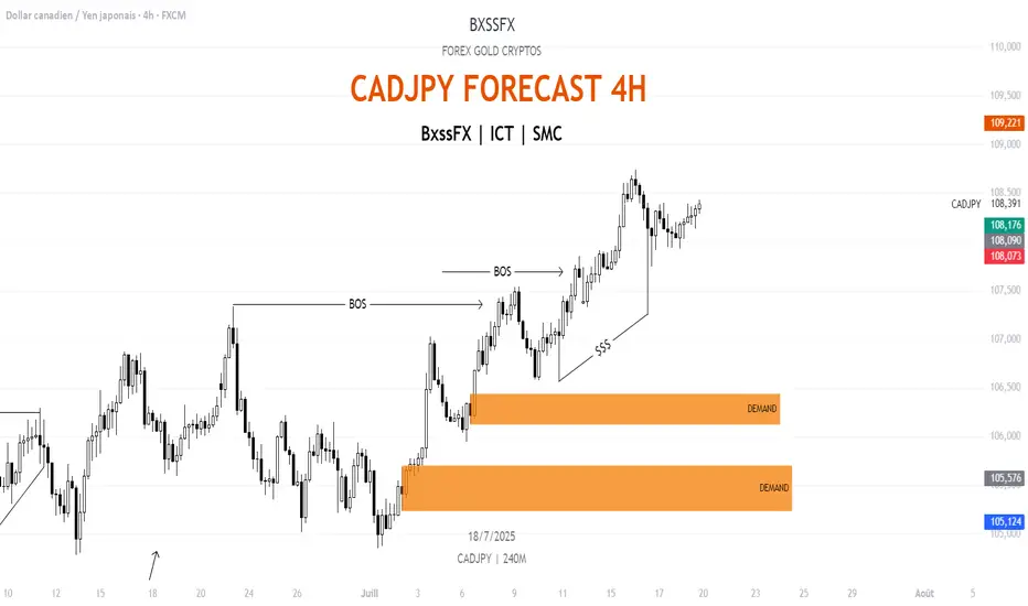 Le prix est dans une forte tendance haussière, validée par plusieurs Breaks of Structure (BOS) successifs. Deux zones Demand ont été marquées comme zones de soutien clé. Tant que le prix respecte ces zones, le biais reste haussier.