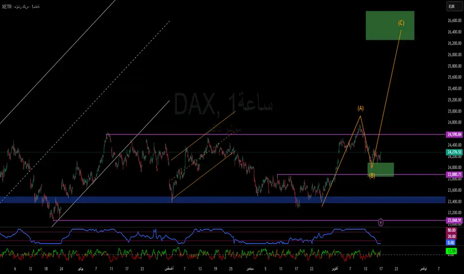 مع تراجع التضخم في منطقة اليورو واستقرار السياسة النقدية، سيتحوّل DAX إلى مركز جذب سيولة جديدة، لتبدأ موجة (C) التي قد تمتد حتى 26,500 خلال الربع القادم.