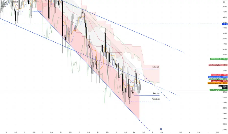 -Die Richtung zu suchender Trades heute ist short. Beste Gelegenheit dazu bieten sich an, falls der DAX die 24.000'er Marke/das Nachthoch bei ca 24.020, die Anchored VWAPS aus der Analyse letzte Woche antestet und Schwächeanzeichen/Umkehrkerzen zeigt. Dies sollte am besten am Vormittag versucht werden. Aufgrund des US Feiertags, besteht am Nachmittag das Risiko des fehlenden Handelsvolumens.
