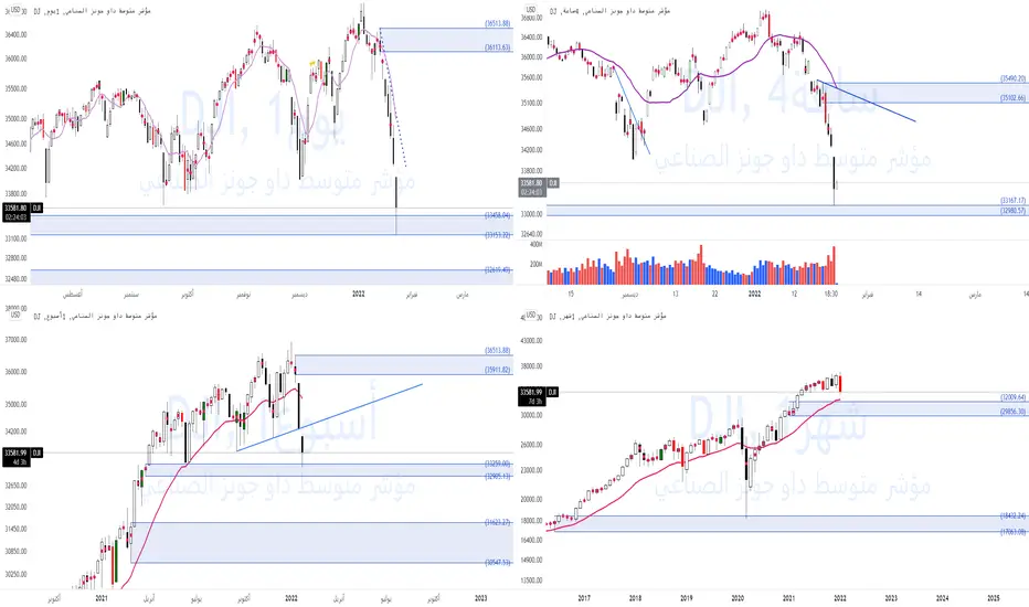 DJI has broke a main weekly uptrend with a gap. We shall wait to the end of the week and look at the close on friday. Daily and hourly frames are downtrend, but still uptrend on monthly frame that bounced from a weekly demand zone waiting to reach the monthly demand zone supported by the moving average. Zones are shown in the charts waiting to be reached or maybe creating new zones on the daily frame.إخلاء المسؤولية