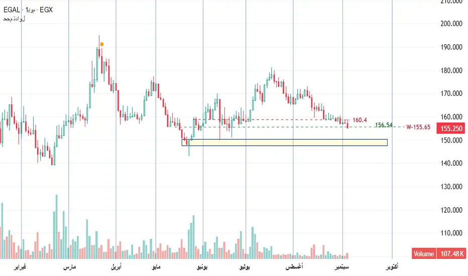 دعم قوي: يظهر بوضوح في الرسم البياني عند المنطقة بين 150 - 152 جنيه، حيث ارتد السهم منها أكثر من مرة في السابق. هذا المستوى يمثل منطقة طلب قوية.