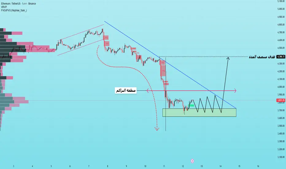 بعد تصحيح قوي، تشكل ETHUSDT على BINANCE منطقة تراكم مستقرة حول منطقة الدعم البالغة 3700، والتي يظهرها حجم التداول الكثيف (VRVP) وسلسلة من التقلبات الأفقية في منطقة الطلب. لا يزال هيكل السعر أدنى من خط الاتجاه الهبوطي قصير المدى، ولكن من الواضح أن زخم البيع قد ضعف.